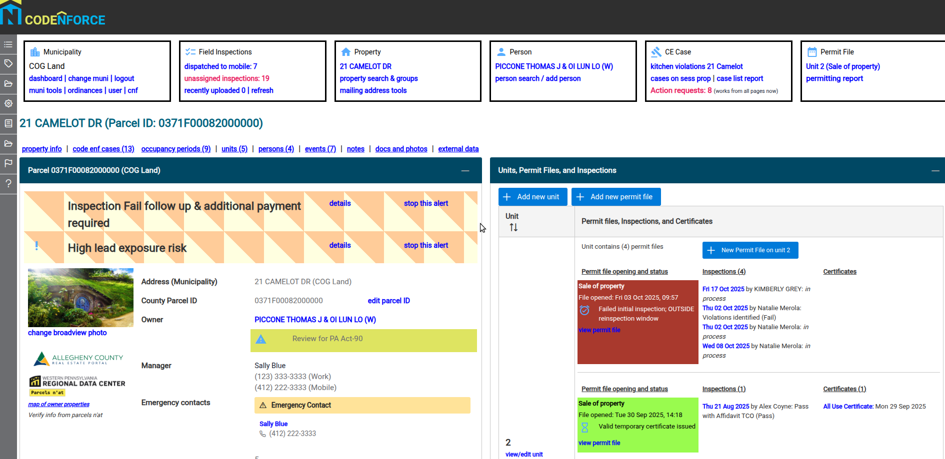 Municipal code officers use codeNforce to organize data about properties, manage their case loads, conduct inspections, issue permits, and respond to resident and staff concerns.